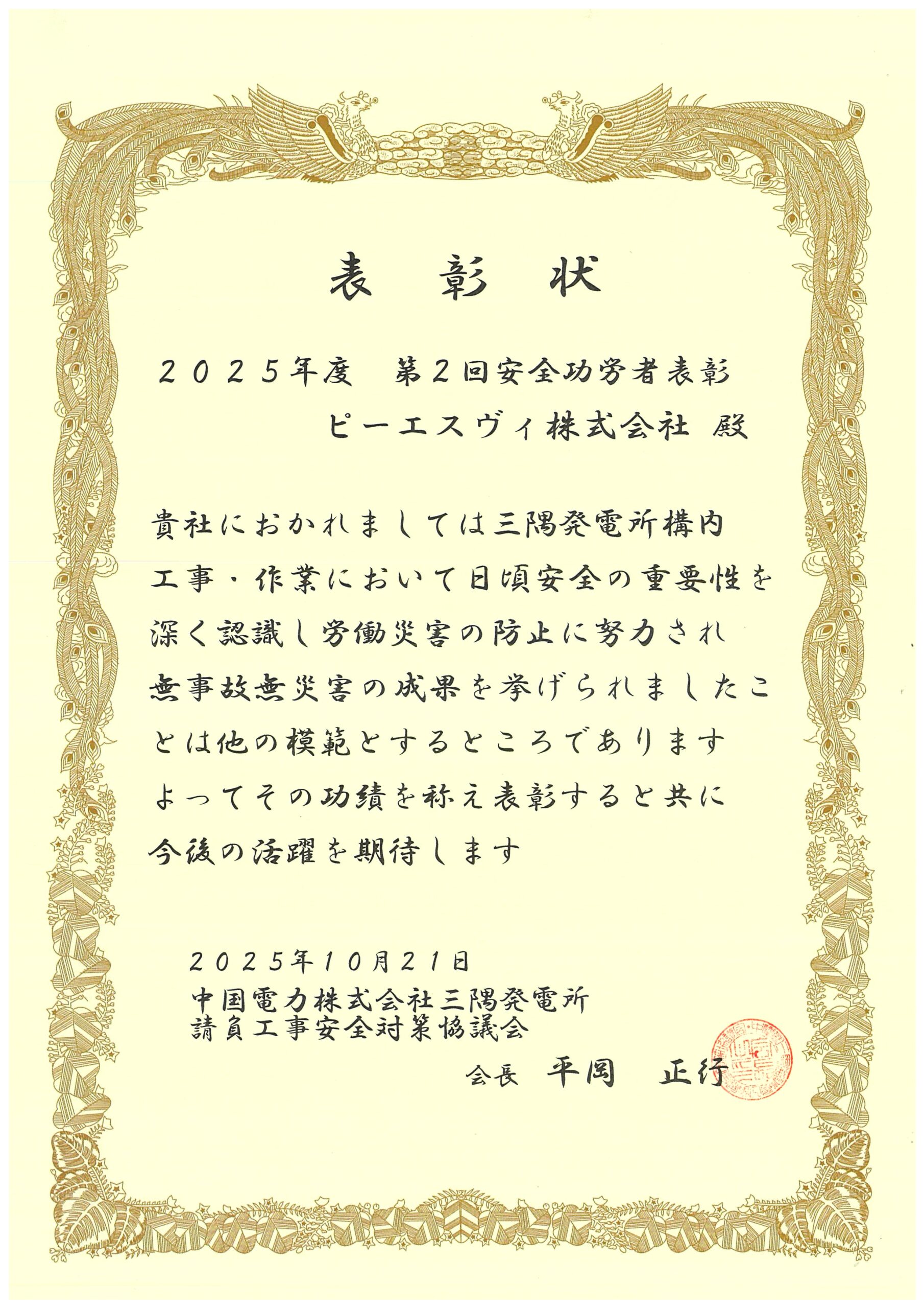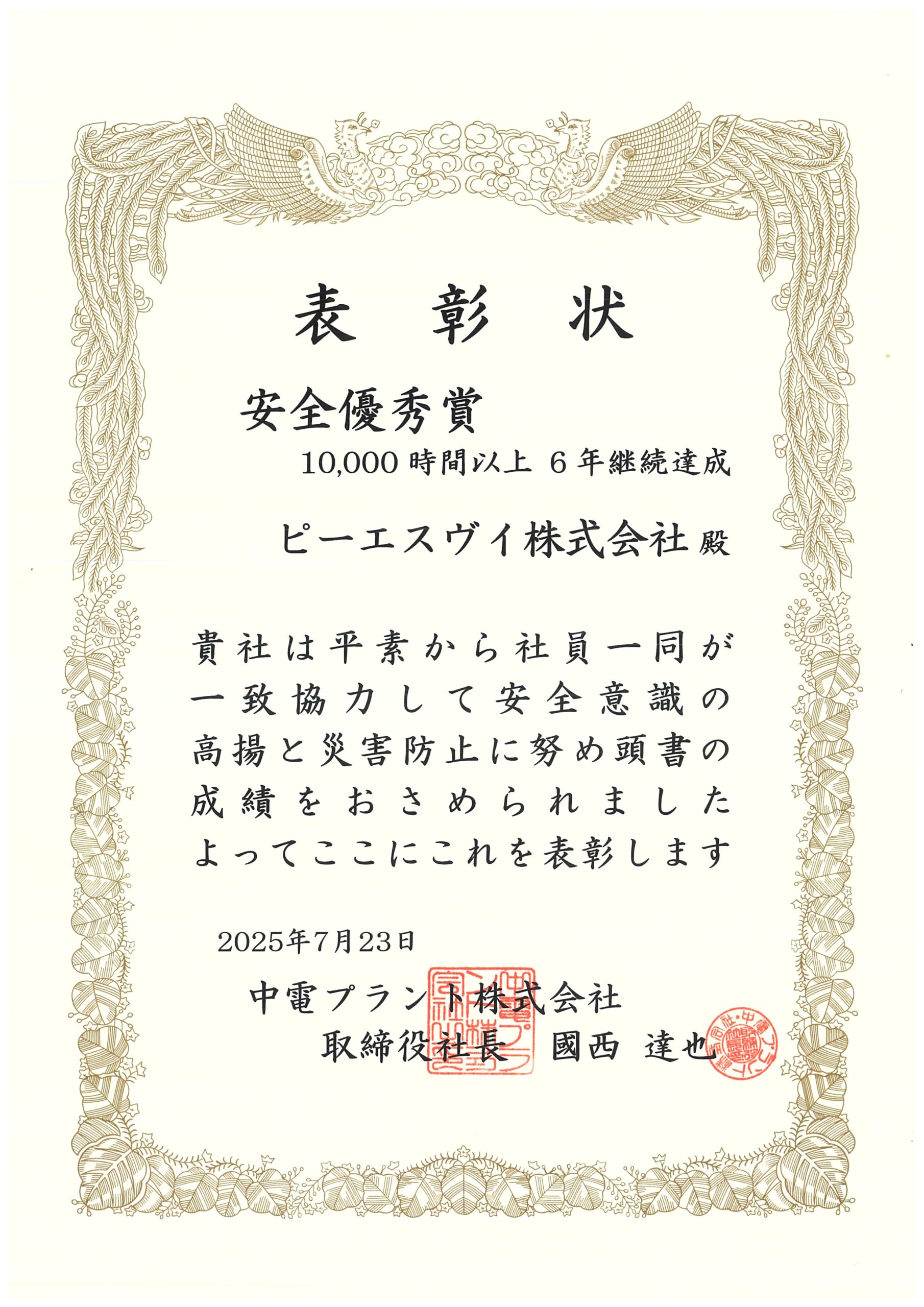 中電プラント株式会社殿より安全優秀賞の表彰を受けました
