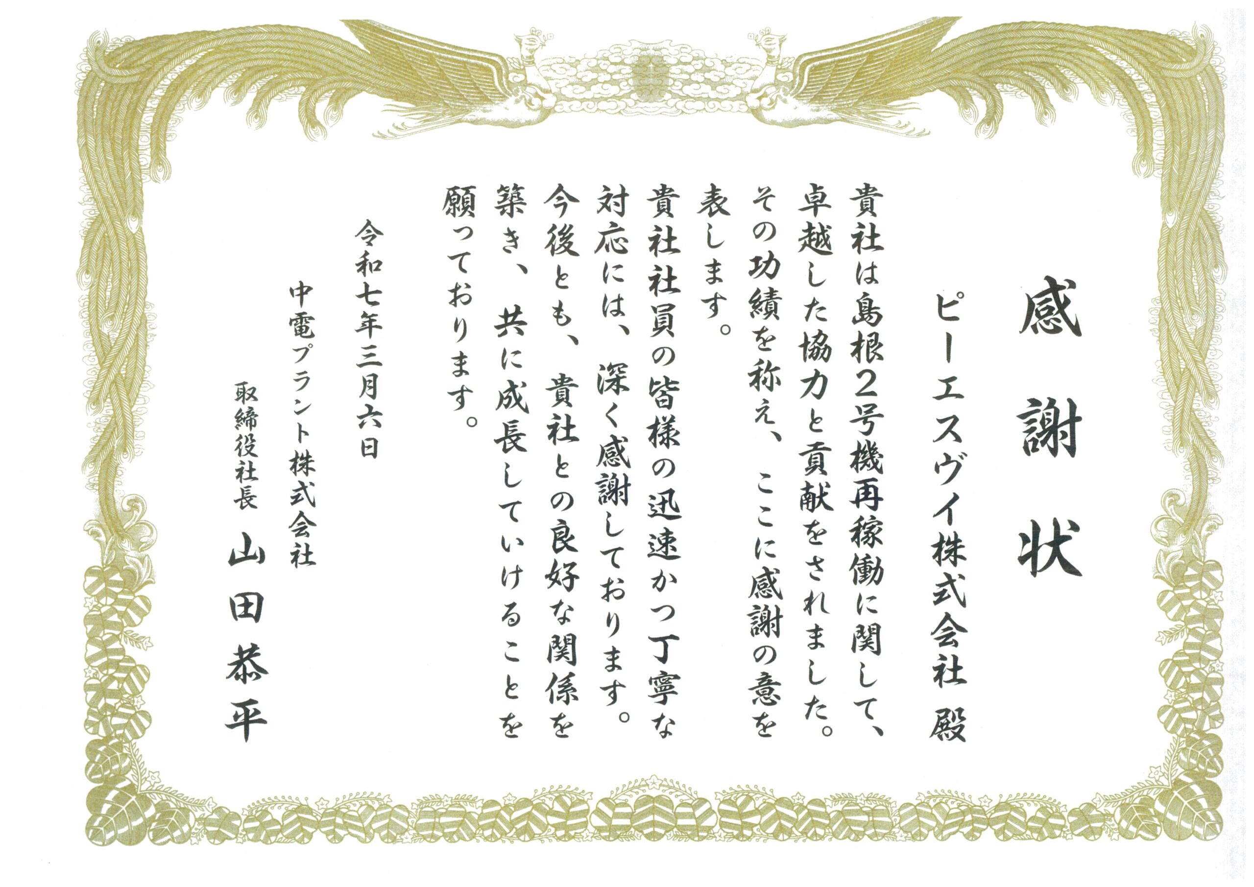 中電プラント株式会社殿より島根2号機再稼働の協力と貢献の表彰を受けました